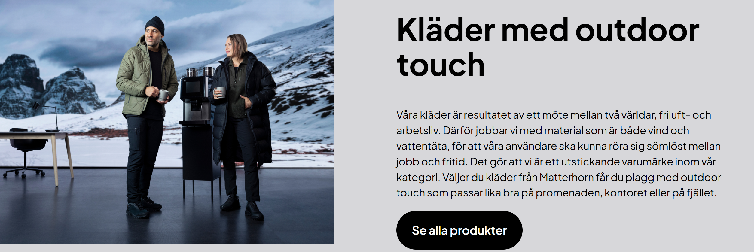 Med inspiration från det nordiska klimatet gör vi plagg som håller, genom både väder och trender. Vi erbjuder stilrena jackor, byxor och andra ytterplagg som är utrustade med väderbeständigt material och tekniker för att hålla dig snygg och bekväm både jobbet och på fritiden. Upptäck Matterhorns sortiment.