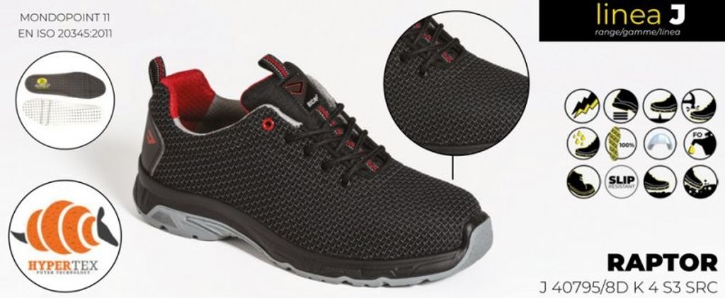 Superlätt skyddssko i vattentät andasmaterial HYPERTEX microfiber. Insida beklädd med andasmaterial som transporterar bort fukt och håller foten torr. Raptor är utrustad med komposit tåhätta och textil spiktrampskydd för låg vikt. Yttersula i slitstark 2-komponents polyuretan. Anatomisk iläggssula COMFORT FRESH som garanterar stabilitet med mycket god stötdämpning.