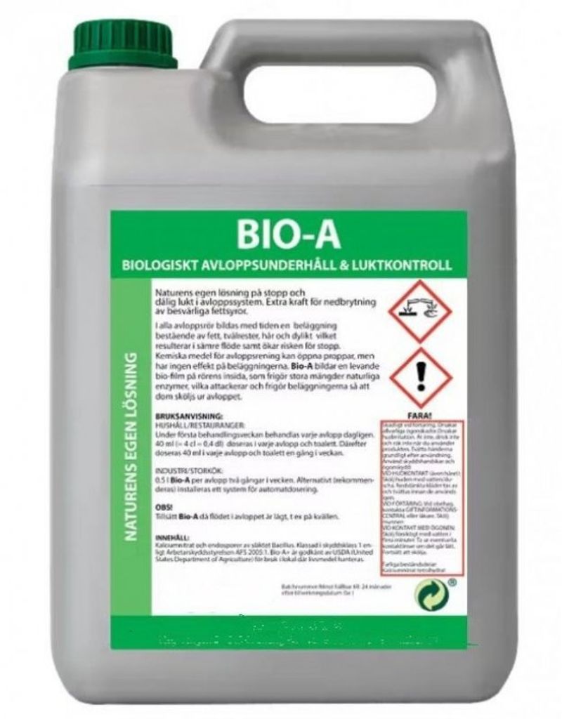 Biobakt 1 liter flaska Nya BioA biologiskt avloppsaner 5 liter Förbättrad produkt för högre positiv syrepåverkan ersätter Biobakt Bakteriekultur biologisk propplösare för bekämpning av dåligt flöde, oönskade lukter och underhåll av avloppsnät, fettavskiljare, pumpstationer och golvbrunnar. Innehåller både naturliga enzymer samt en suspension av speciellt adapterade, naturliga bakterier, med en exceptionell förmåga att bilda en levande beläggning (biofilm) på alla beläggningskänsliga ytor. I denna biofilm sker en kontinuerlig biologisk nedbrytning av det organiska avfallet i avloppsvattnet, och därigenom motverkas bildningen av tjocka beläggningar effektivt. |