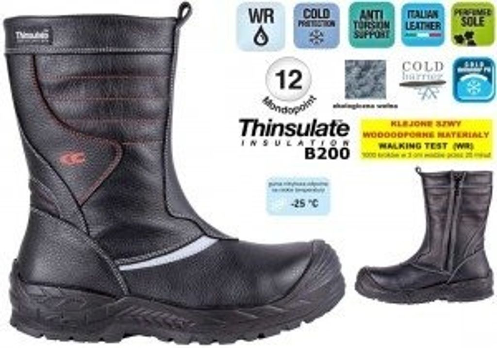 Extra bred. Vinterfodrad stövel med dragkedja. Dubbelfodrad med både pilé och Thinsulate®. Både läder och sula behåller sin styrka och flexibilitet även vid mycket låga temperaturer. Den är utrustad komposithätta och textilspikskydd APT, vilket är superlätt, flexibelt och helt metallfritt. Kyler ej vid låga temperaturer. Ovandel av italienskt läder av mycket hög kvalitet. Slitsula av flexibel PU/nitril med stabiliserande gelänk för att motverka vridning av foten. Förstärkt tå parti.