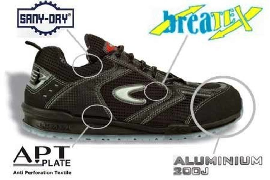 Cofra Petri Snygg sportsko av BREATEX ett material med mycket god andasfunktion vilket ger en behaglig temperatur i skon. Insida beklädd med andasmaterialet SANYDRY, vilket andas och transporterar bort fukt. Aluminiumhätta och textilspikskydd APT, vilket är superlätt och mycket flexibelt. Detta gör skon mycket lätt och komfortabel. Iläggssulan Cofra-soft ger foten en skön komfort och absorberar och transporterar bort fukt från foten. Slitsula av PU/TPU. Mjuk PU för bästa stötdämpning och TPU för bra grepp och hög slitstyrka.