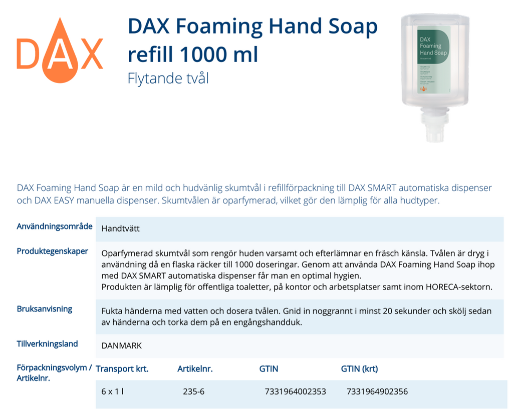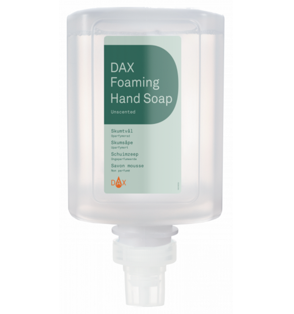 DAX Foaming Hand Soap är en mild och hudvänlig skumtvål i refillförpackning till DAX SMART touchfree automatiska dispenser och DAX EASY manuella dispenser med tryckplatta. Skumtvålen är oparfymerad, vilket gör den lämplig för alla hudtyper.