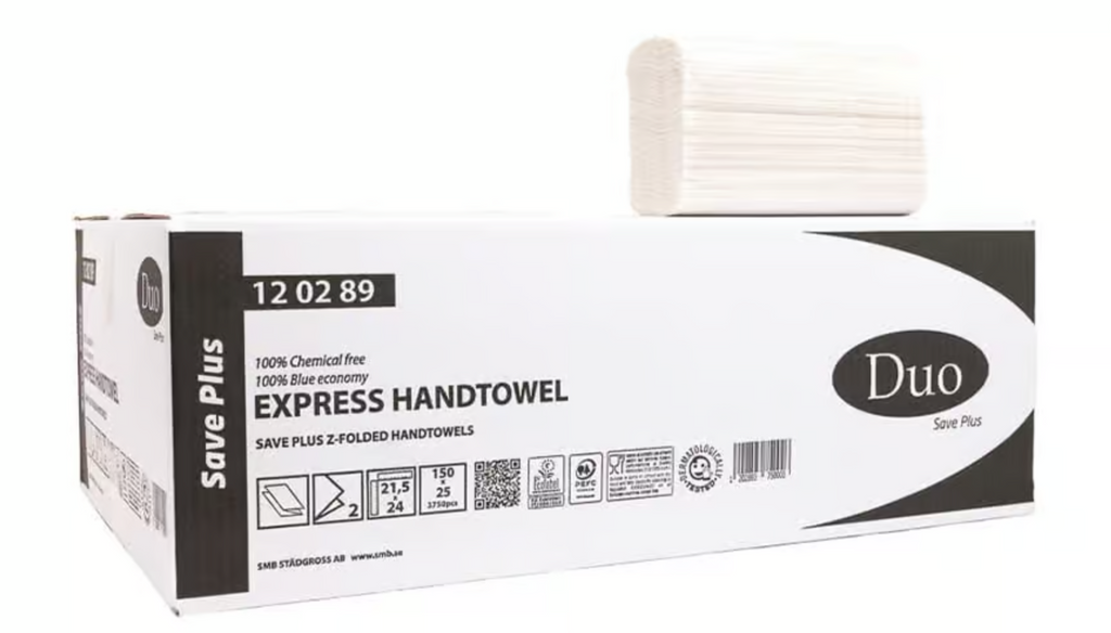 Duo Express Kedjevikt Save Plus 3750 ark – 2-lager kedjevikt pappershandduk. Z-vikt. Natur Vit. Högabsorberande material. Livsmedelsgodkänd. EU Ecolabel. Dermatologiskt testad. Lämpar sig för miljöer som kräver både komfort och hygien – såsom restauranger, kontor och sjukhus. En handduk i taget: hygieniskt och minskad förbrukning. Kartongen är enkel att bära, lätt att öppna, lätt att platta till och lätt att bära bort. 3750 ark/krt. 40 krt/pall. ca 21,5×24 cm. H2.