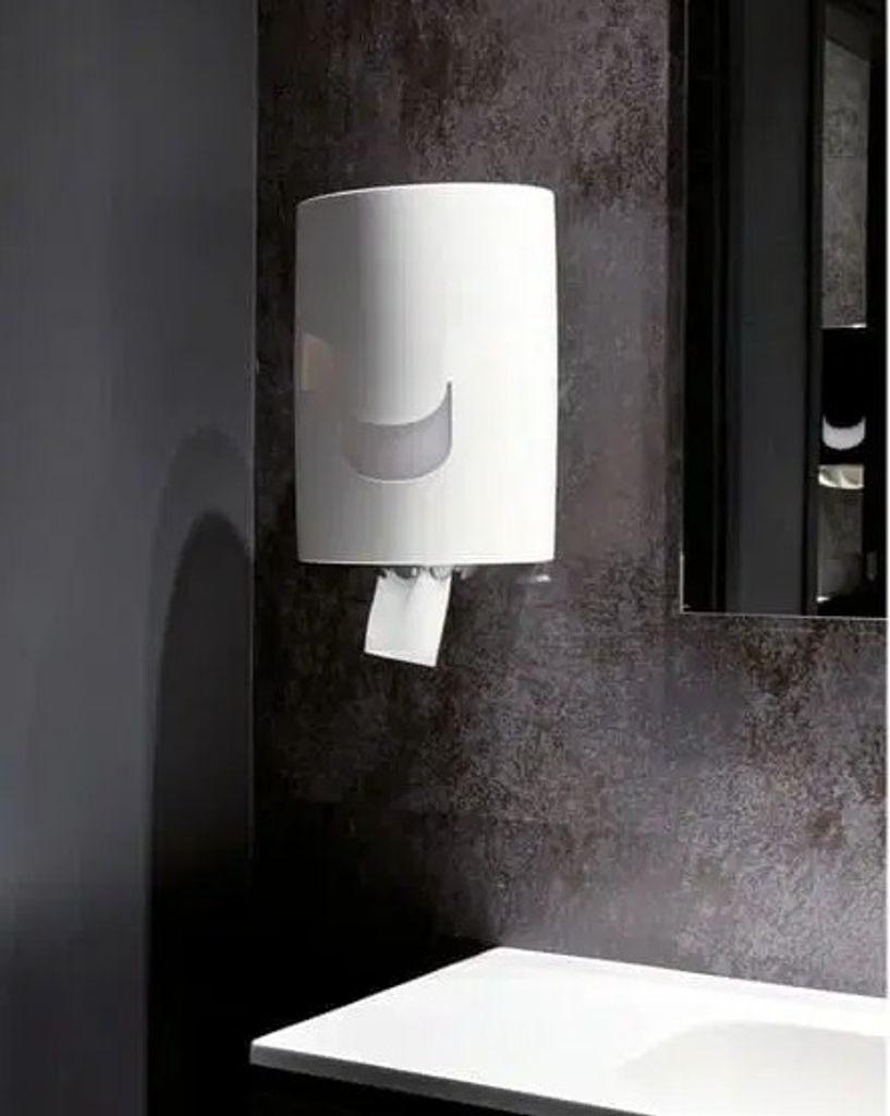 Duo Dispenser Mellantork och Minitork. Vit – Centrummatad dispenser som passar till artnr 110040 och 110030. Duo Dispenser Mellantork är lämplig för miljöer som kräver både komfort och hygien – såsom hotell, restauranger, kontor, gym och vårdinrättningar. Det är en robust dispenser som klarar av hög trafik utan att försämras under lång tids användning.