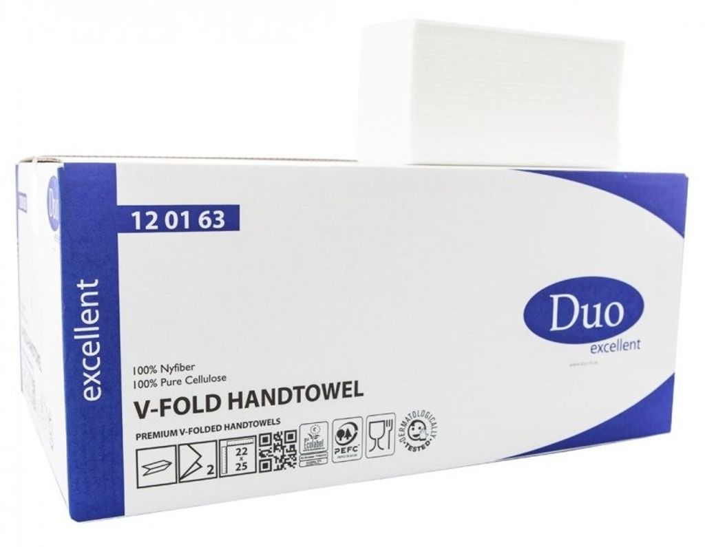 Duo V-Vikt Pappershandduk Premium – 2-lager premium nyfiber V-Vikt pappershandduk. Vit. Högabsorberande material. Livsmedelsgodkänd. EU Ecolabel. Dermatologiskt testad. 4000 ark/krt 36 krt/pall. ca 23×25 cm. H3.