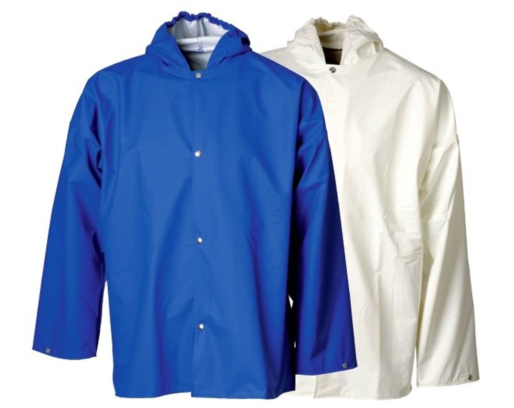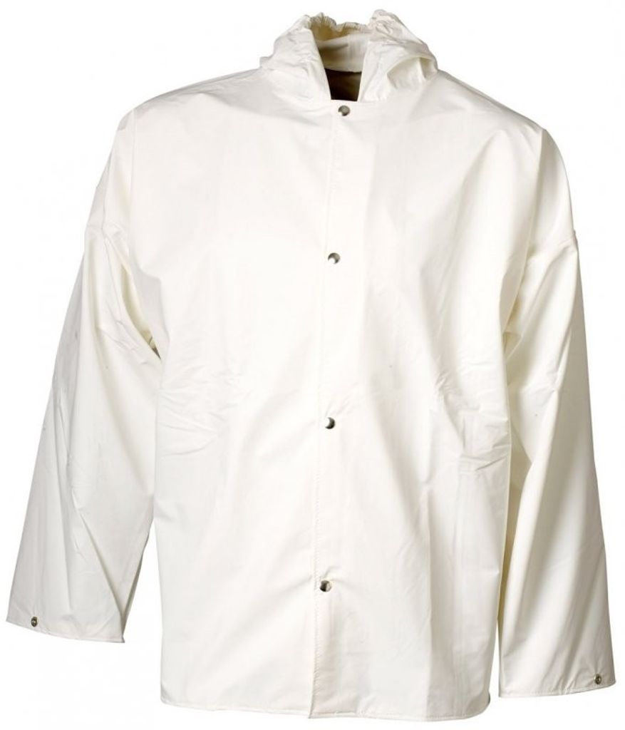 Fast huva. Vindslå med tryckknappar och elastiska ärmar. Idealisk för rengöring i livsmedelsindustri. Mjuk PU-material ger hög komfort och slitstyrka. Teflonbehandlad nylon innsida gör plagget vattentät "inside out". Vit plagg kan tvättas i 90 grader. Skydd mot starka kemikalier.