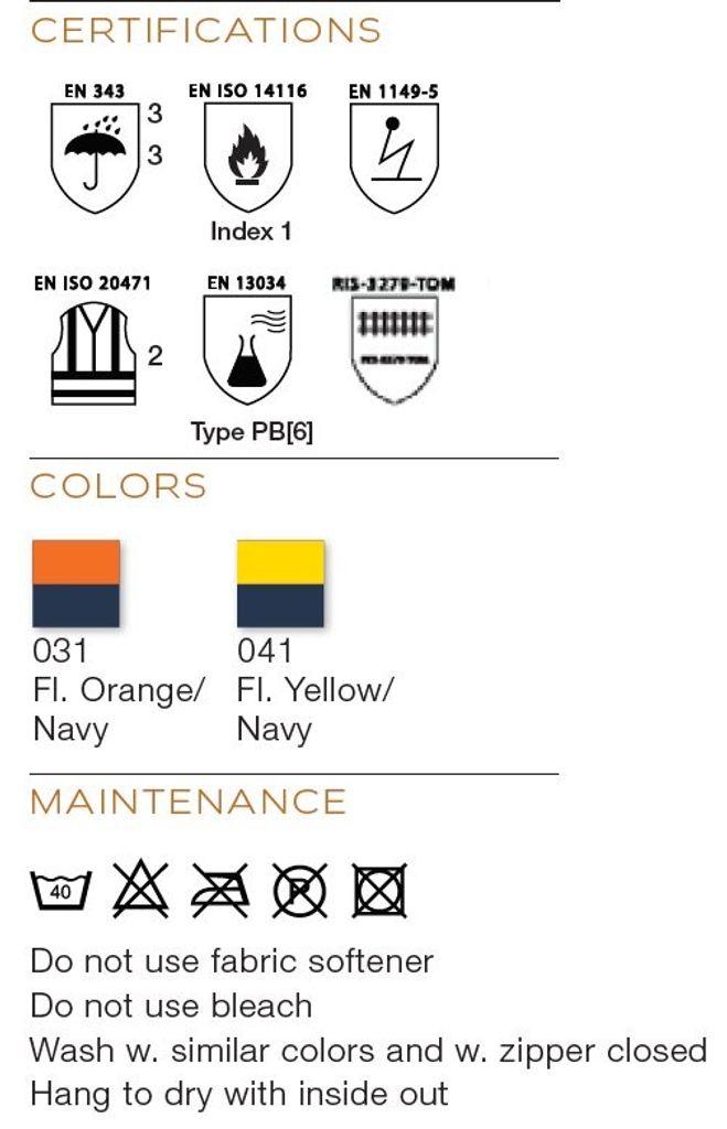 98% Oxford polyester 300Dx 300D, 2% Carbon Andasfaktor: > 5.000 g m2 Vattenpelare: mm H2O: > 8.000 mm. RIS-3279-TOM certificering är enbart gällande för orange byxa.