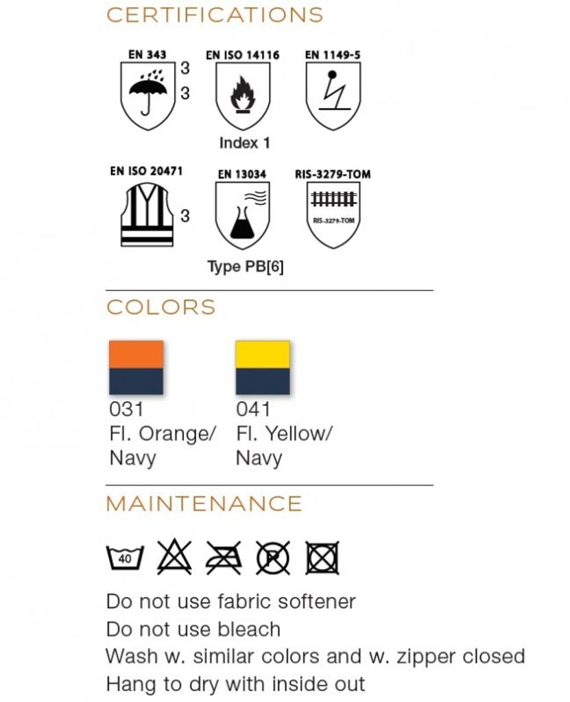 | Sammansättning | 98% Oxford polyester 300D x 300D, 2% kol, 240 gram / m2 Inre jacka / foder: 100% FR bomull - 80 gram / m² polyester vaddering |