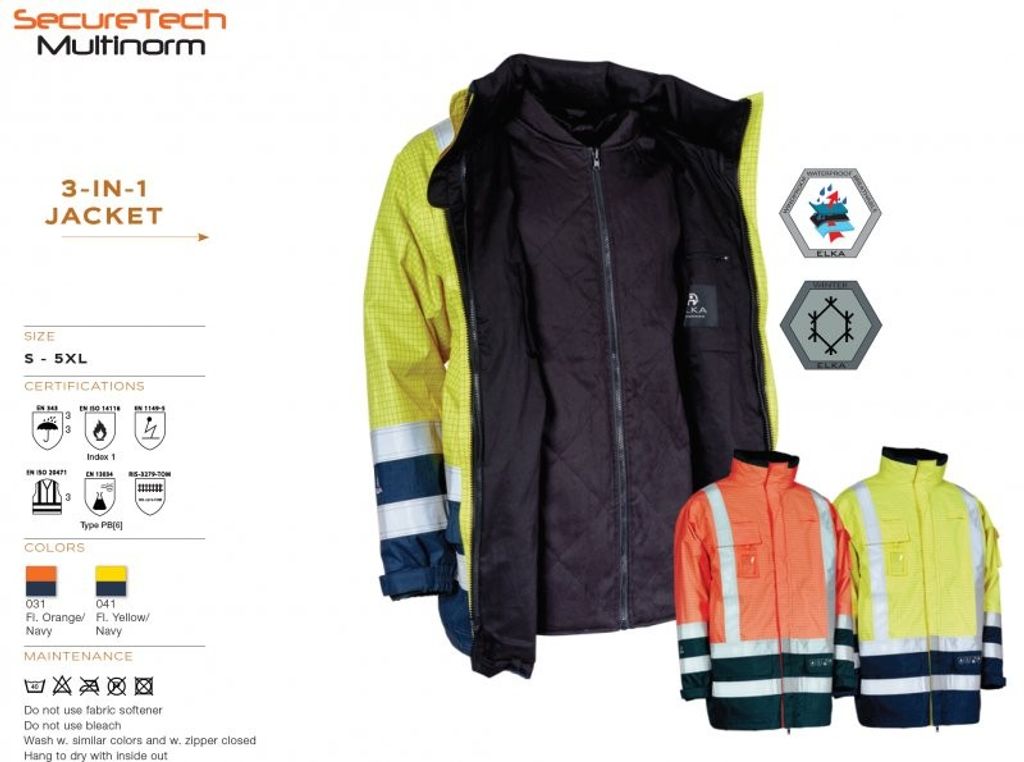 I linje med ökande krav från industrimarknaderna har ELKA utvecklat en serie högkvalitativa och certifierade arbetskläder för optimal säkerhet i de mest utsatta arbetsområdena. Produkterna finns i det flexibla och slitstarka PU / polyestermaterialet som kombinerar en hög rivhållfasthet med en naturlig elasticitet och komfort. SecureTech Multinorm-kollektionen innehåller också produkter av Oxford polyester, som är 100% vindtät, vattentät och andas. Produkterna lever upp till ett antal EN-standarder, som alla ställer höga krav på design och prestanda för säkerhetskläder. Alla ELKA-produkter är certifierade vid EU-godkända testinstitut.