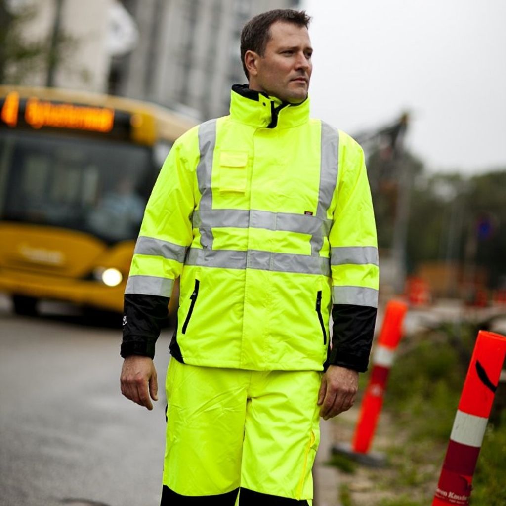 Teflonbehandlad Oxford polyester. Tejpade sömmar. Två framfickor med dragkedja. Två bakfickor med kardborrelås. En större benficka. Hammarhank och tumstockficka. Corduraförstärk i knä. Flertal 3M Scotchlite reflexer. Vatten och vindtät med hög andningsförmåga
