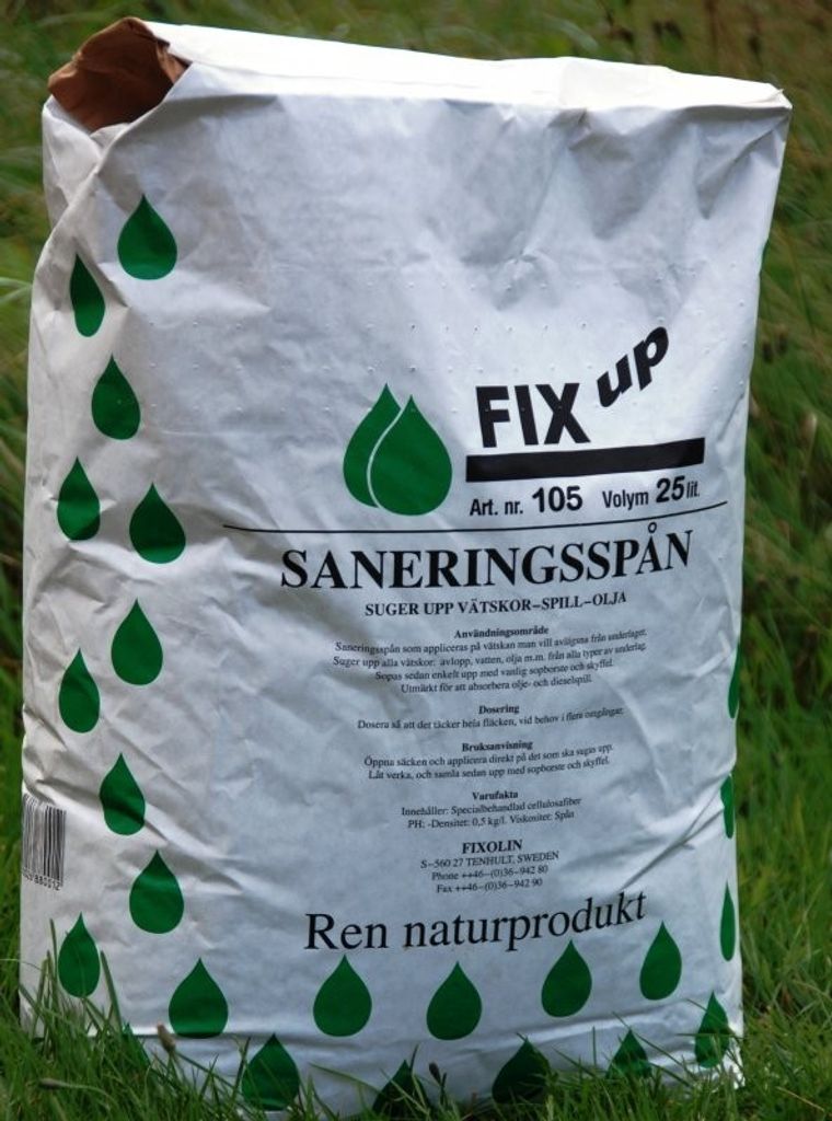 Suger upp vätska, farligt spill som exempelvis olja på golv och andra ytor. Kan enkelt sopas upp med borste och skyffel. Mycket hög och snabb absorberingsförmåga. Till skillnad från andra absorberingsmedel som kan vara giftigt och miljöfarligt i sig är Fix Up saneringsspån en ren naturprodukt gjord av specialbehandlade cellulosafibrer. Fix Up är därför tillåten att sorteras i vanliga soporna såvida spillet/vätskan som är absorberad i Fix inte är miljöfarlig.