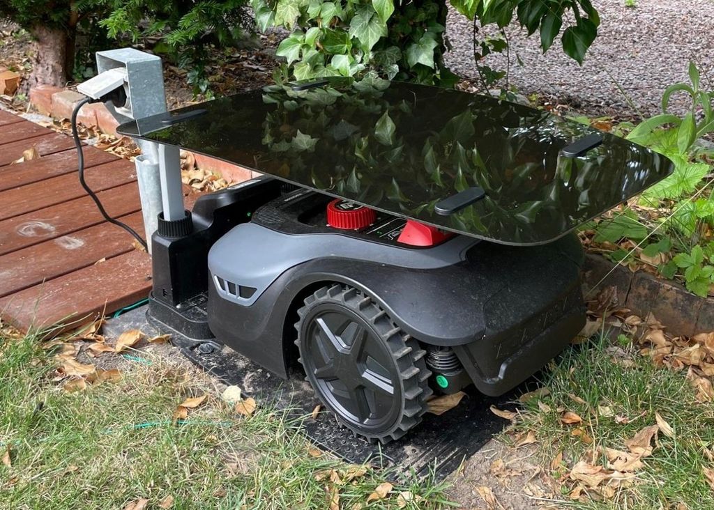 genomskinliga plexiglaset täcker robotgräsklipparen när den laddar eller bara