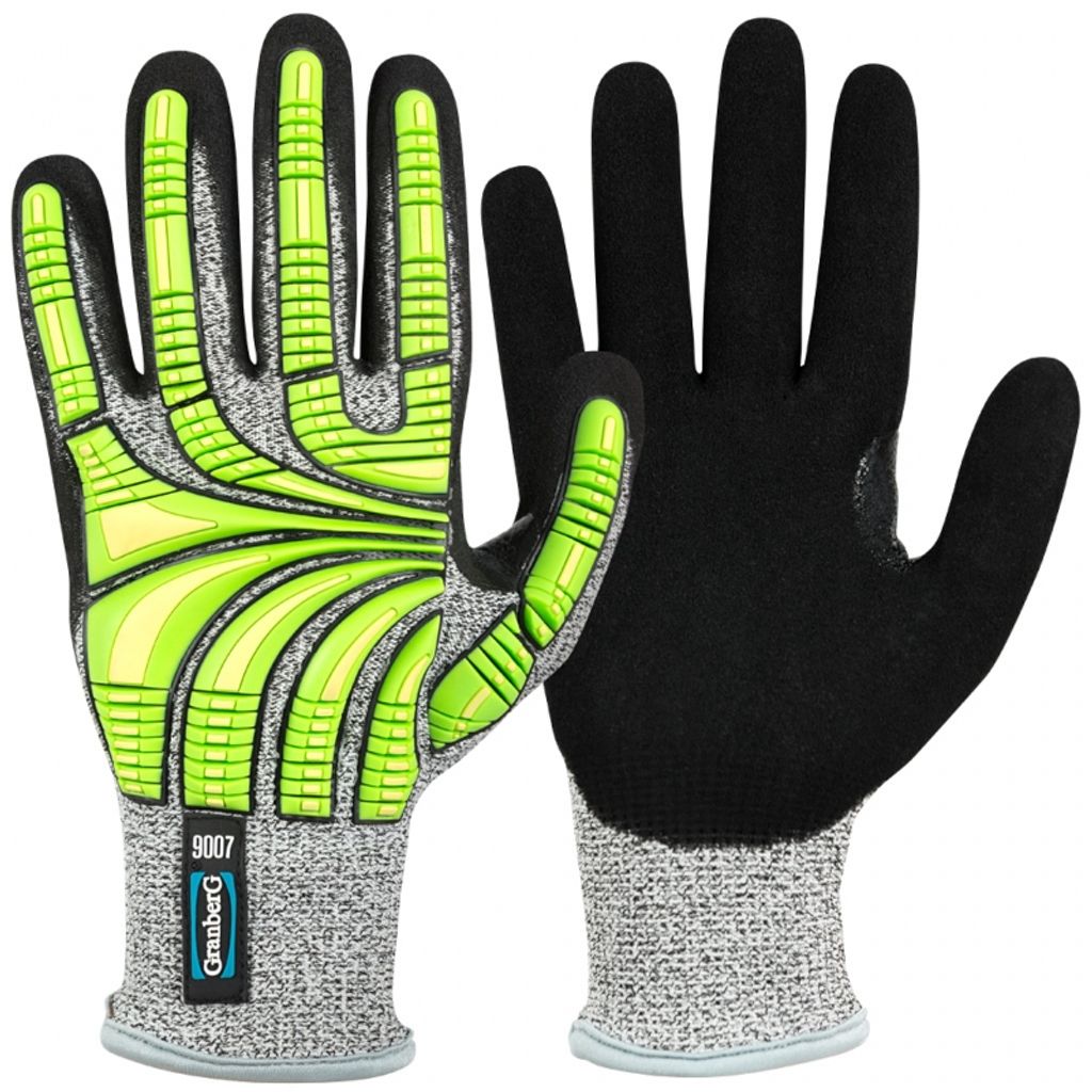 Granberg 115.9007 Slagskyddshandskar med skärskydd Typhoon®-fiber med nitrilbeläggning. Typhoon® ger ett 360° skärskydd (EN 388). Mjukt men kraftigt slagskydd på ovanhand ger skydd mot hårda kanter, klämskador och fallande objek. Utformade med fokus på ergonomi; mycket bekväma handskar trots kraftigt skydd. Slitstark, sandaktig nitrilbeläggning i innerhand ger utmärkt grepp. Oljebeständiga. Hi-Viz™ synbarhetsdetaljer för ökad säkerhet.