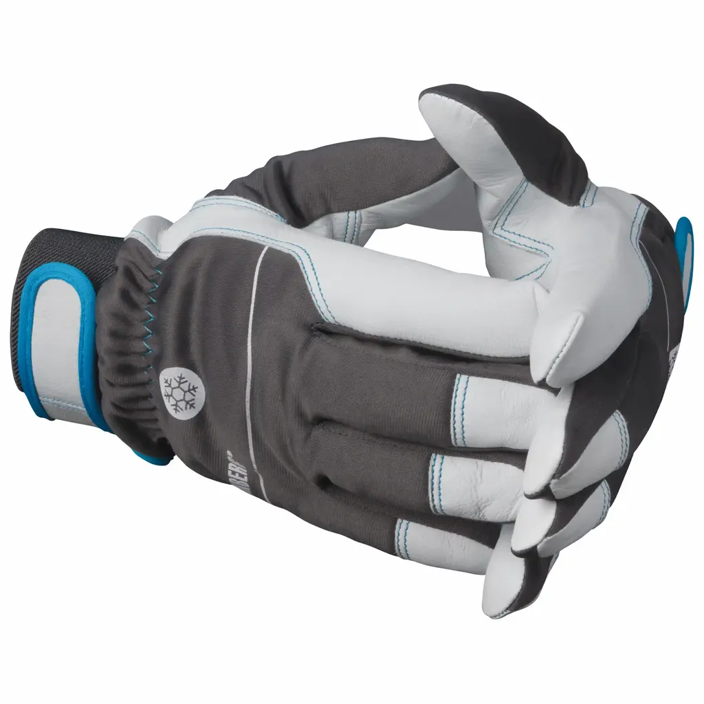 Vinterhandske i getskinn med ovanhand i polyester. Handsken har kardborreknäppning och mudd för ökad komfort och känsla. Fodrad i ett varmt fleecefoder. Behöver du arbetshandskar för grovt arbete men även vill behålla fingertoppskänslan så är dessa handskar ett utmärkt val. Getnarv är starkare än oxnarv med hänsyn till tjocklek.