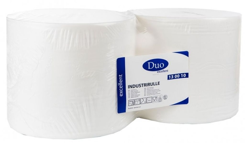 Industrirulle Duo Premium Vit 1000m – 1-lagers premium industrirulle av högsta kvalité för de mest krävande uppgifterna. Idealisk vid upptorkning av olja och vatten, i synnerhet när det handlar om stora mängder. Vårt bästa papper när det gäller våtstyrka och uppsugningsförmåga. Högabsorberande material. Livsmedelsgodkänd. EU Ecolabel. Dermatologiskt testad. 1000 m/rle,