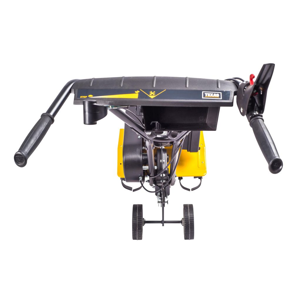 Kraftig trädgårdsfräs från TEXAS, där du får flera praktiska arbetsbredder, en dedikerad backväxel och ett tillbehörspaket med hjul och hackplog.
