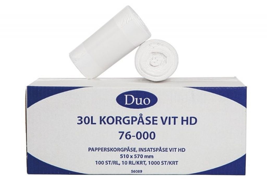 Insatspåse för papperskorgar på kontor (korgpåse). Våra korgpåsar sticker ut inte bara för att de förenklar hanteringen, men också på grund av en den speciella blandningen av råvaror och en särskild tillverkningsmetod. Något som gör denna speciella HDPE film betydligt mer slitstark och punkteringssäker jämfört med konventionella HDPE material av samma tjocklek. De förbättrade tekniska egenskaperna i materialet gör påsen mycket tillförlitlig. Framtagen för förvaring av vått eller torrt avfall och de kan användas för daglig avfallshantering. Tillverkade av högdensitetspolyeten (HDPE). Påsarna är 100 % återvinningsbara, vilket gör dem miljövänliga. De rymmer upp till 30 liter avfall. För miljöer med hög belastning där stora mängder avfall kastas dagligen är dessa påsar praktiska tack vare sin styrka och hållbarhet. Korgpåsarna är vita.