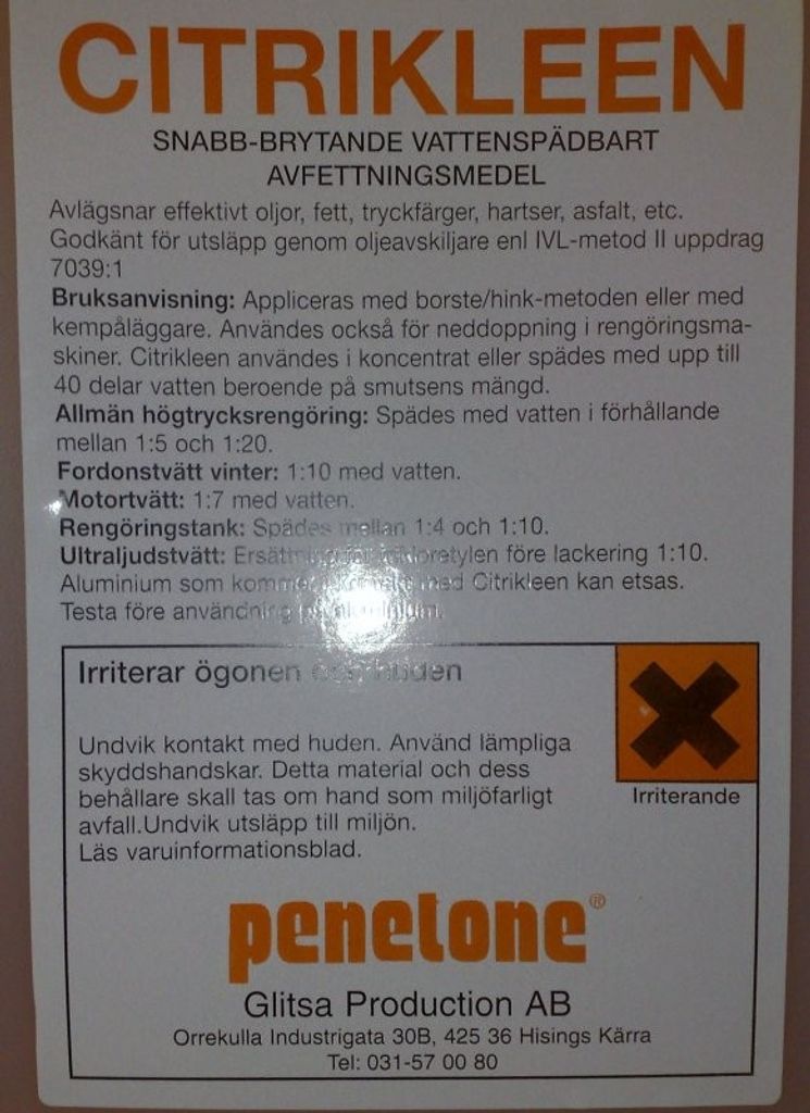 Verkningssätt: Citrikleen är uppbyggd på apelsinolja dvs vegetabiliska lösningsmedel (D-Limonén) kombinerat med omsorgsfullt utvalda tensider, som tillsammans resulterar i ett överlägset avfettningsmedel för industriellt bruk och som arbetar effektivt utan värme. Citrikleen är det effektivaste medlet bortsett från petroleumbaserade medel.