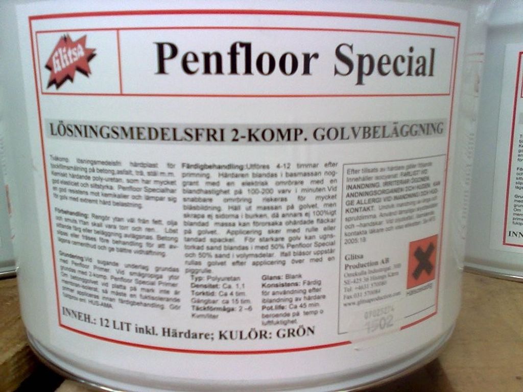 Egenskaper: Två-komponent lösningsmedelsfri härdplastmassa med 100% torrhalt för tjockfilmsmålning på ytor av betong, asfalt, flintcote, trä och stål, som utsätts för hög belastning och stort slitage. Penfloor Special har mycket god resistens mot lösningsmedel, värme, fett och kemikalier.
