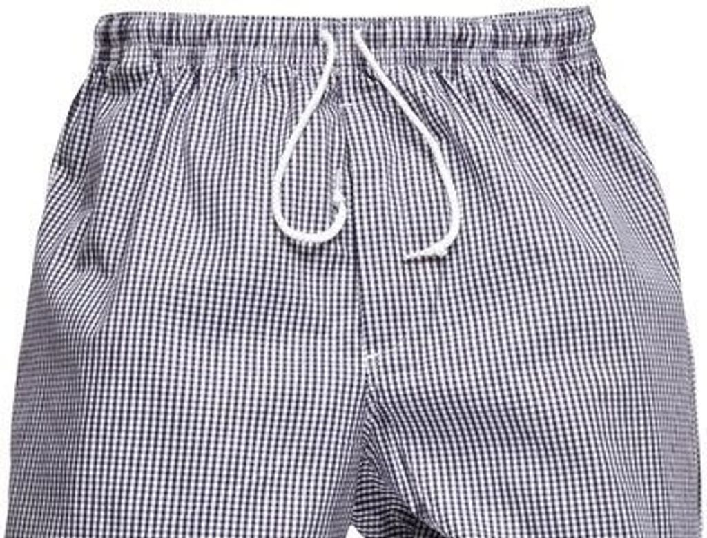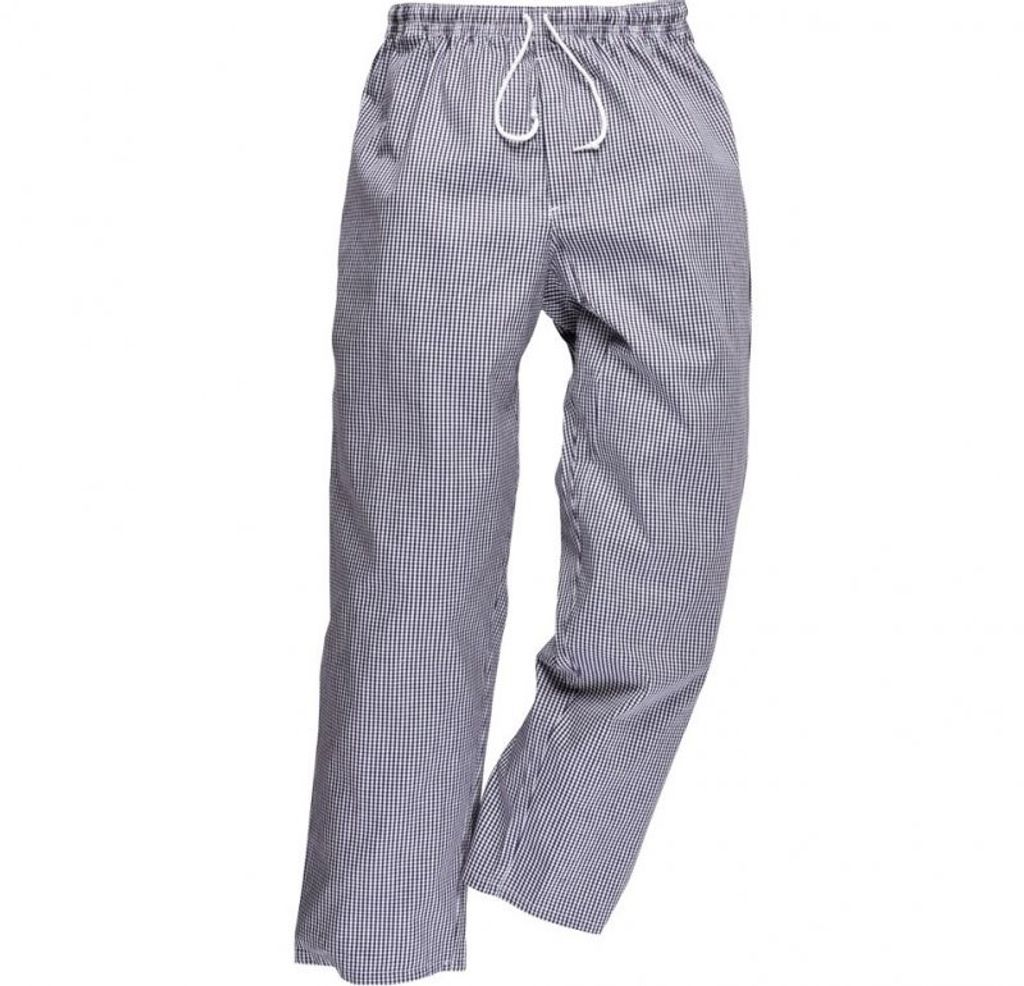 Praktiskt och slitstark pepitabyxa med komfort och funktionalitet. Resår i midjan med justerbar dragsko , dold dragkedja med slå , en bakficka. En prisvärd kockbyxa, livsmedelsbyxa eller bagarbyxa.