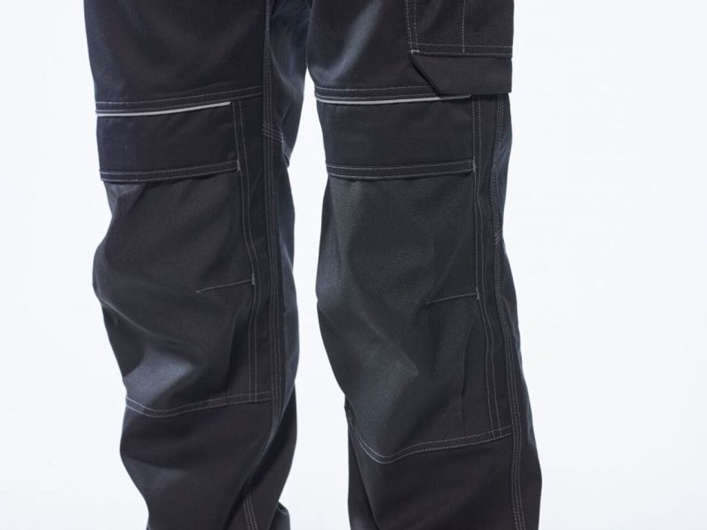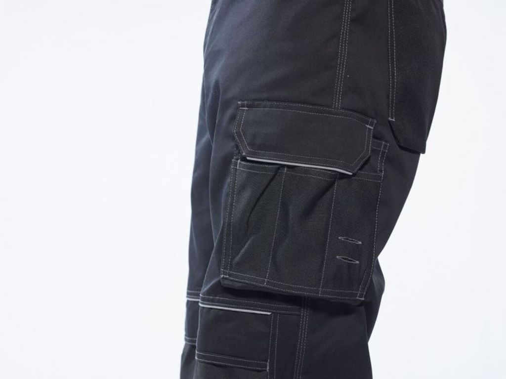Strech paneller för extra bra comfort och rörelse. 10 fickor för gott om förvaring, 65% återvunnen polyester, 35% bomull 245 gram/m2. Storlek: 28-48 tum.