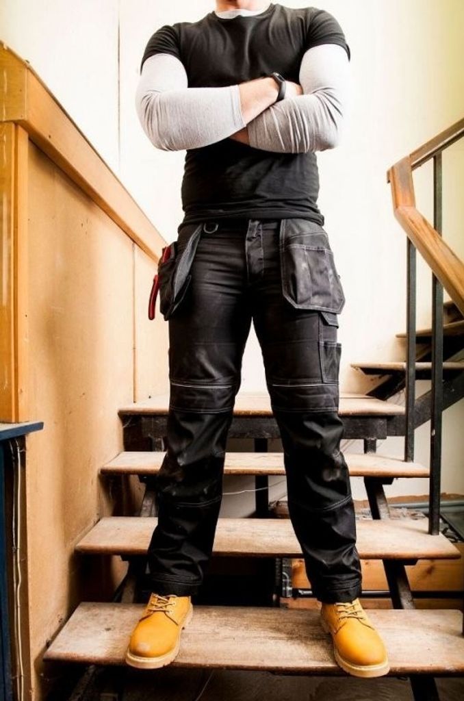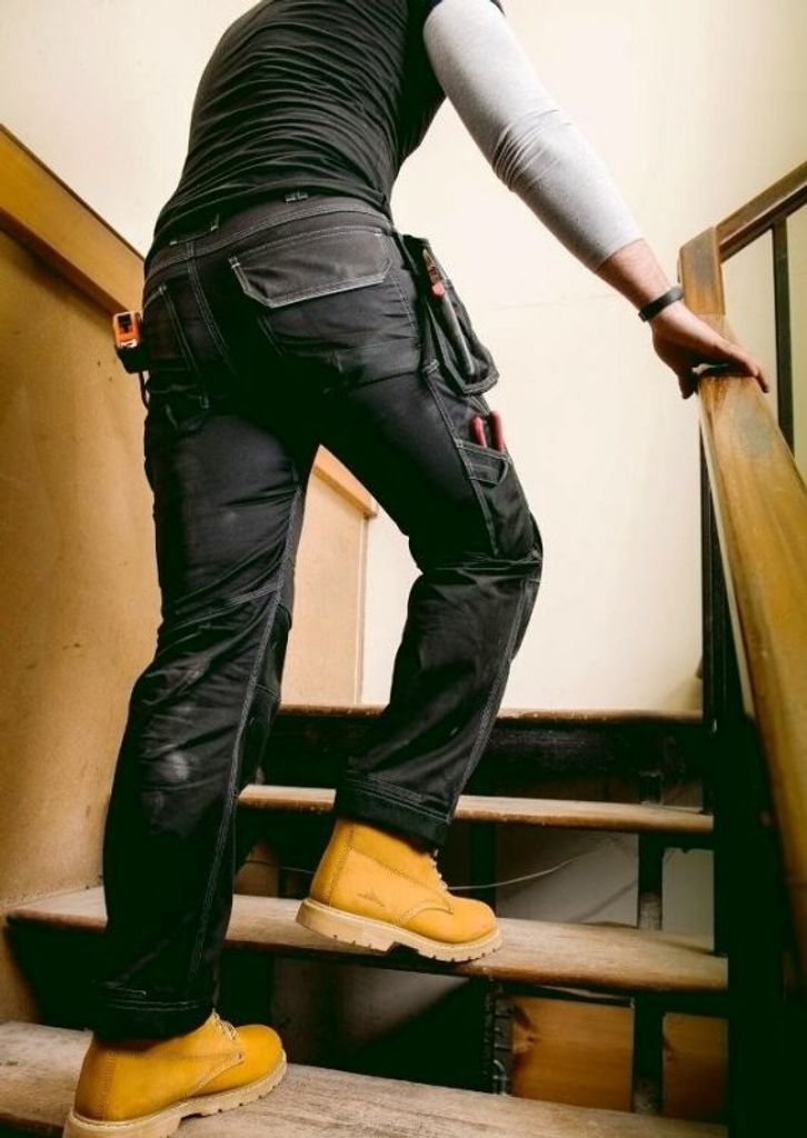 Hantverksbyxa med bra passform och resår i linning bak. Två stycken klassiska spikfickor, två fram- och bakfickor med extra vidd, tumstocksficka, benfickor med lock varav en har mobilficka, två hammarhankar varav en är justerbar, knivknapp och knivhälla. Förböjda ben och knäfickor med förstärkning. Extra 4 cm färdigfållad benlängd för önskad förlängning ben inbakat i fållen.