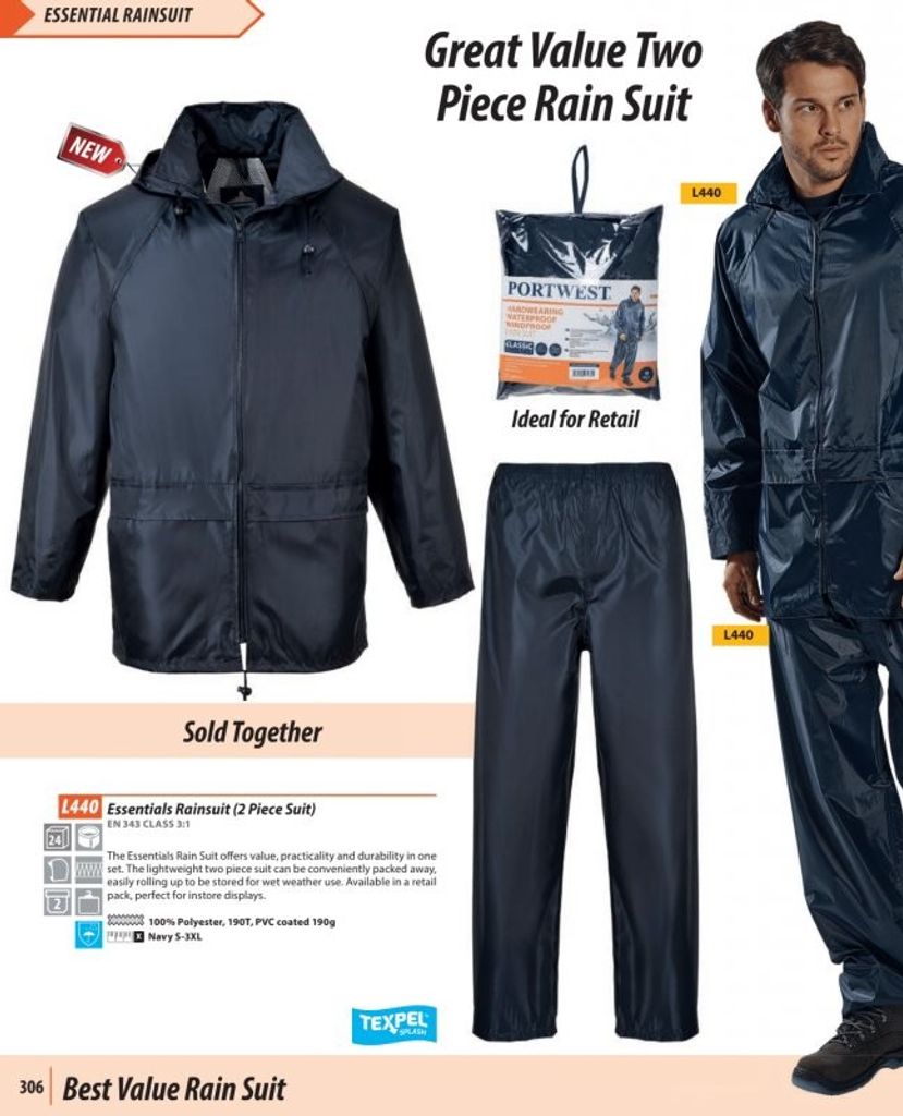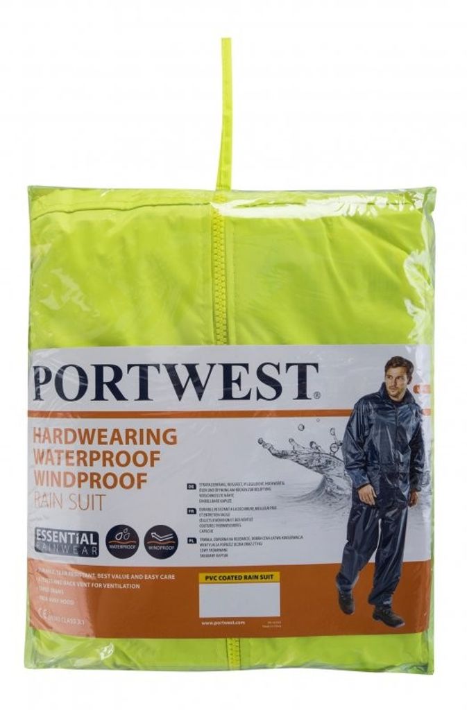 Ett regnställ som ger extremt bra värde för pengarna. Välj mellan varselgul eller marin färg. PVCbelagd polyester. Dragkedja av bra kvalitet. Levereras i butiksförpackning.
