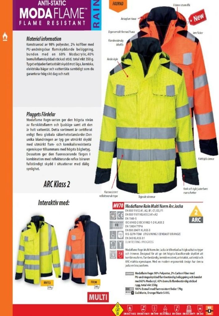 Portwest MV70 Modaflame Rain Multi Norm Arc Jacket är tillverkad I högkvalitativa tyger och design. För att ge det högst rankade skyddet som kombinerar höga, flamsäkra, kemikaliebeständiga, antistatiska, vattentäta och ARC-klassade egenskaper. Med en uppdaterad ergonomisk design har den här jackan perfekt passform.