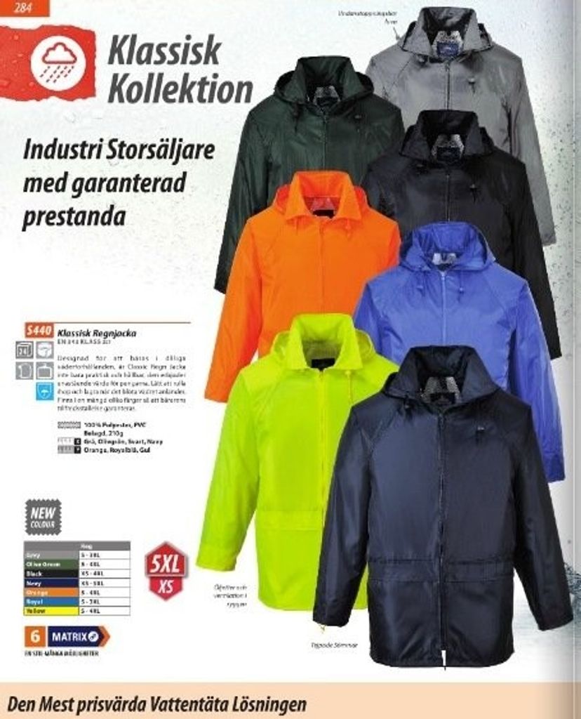 Klassisk regnjacka i flertal olika färger. Tillverkad i 100% polyester och belagd med PVC för att bäras i alla väderförhållanden. 100% vattentät mjukt, smidigt tyg. Enastående värde för pengarna. Hög slitstyrka och regnsäkerhet. Tejpade sömmar. Dragsko i huva. Två stora djupa sidofickor.