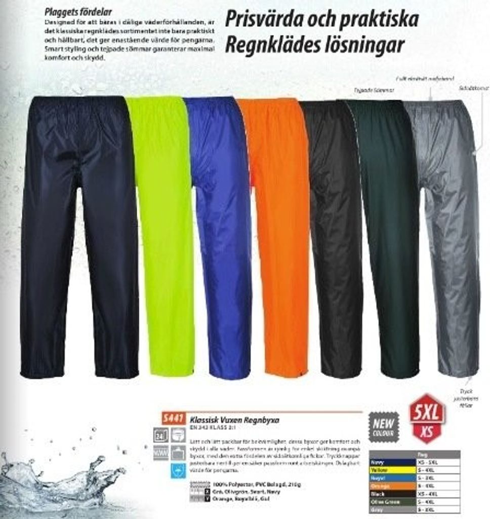 Klassisk regnbyxa i flertal olika färger. Tillverkad i 100% polyester och belagd med PVC för att bäras i alla väderförhållanden. 100% vattentät mjuk smidigt tyg. Enastående värde för pengarna. Hög slitstyrka och regnsäkerhet. Tejpade sömmar. Elastiskt resår i midja och tryckknapp i ankel ger säker passform. 2 Sidoöppningar med kardborreknäppning för åtkomst till fickor i inre byxa.