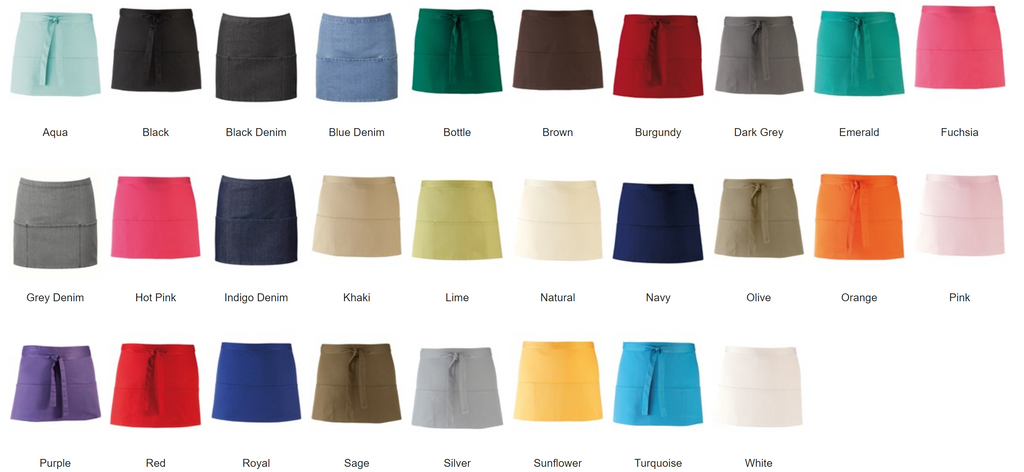 Midjeförkläde som ses i många barer och restauranger, detta korta midjeförkläde har tre öppna fickor och kommer i 24 färger från Premier 'Colours Collection'. Fickorna är bra för att bära betalningsterminaler och surfplattor.