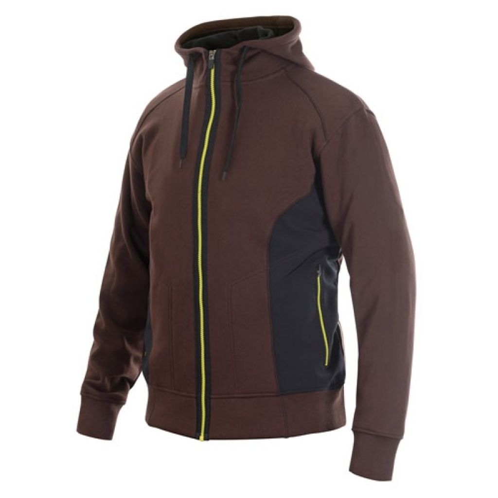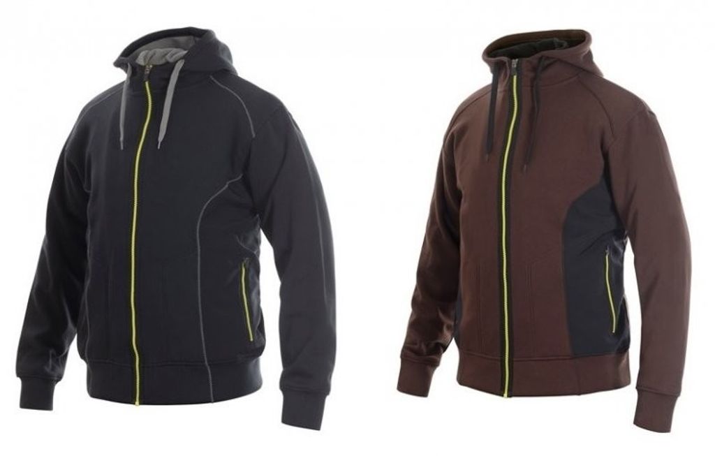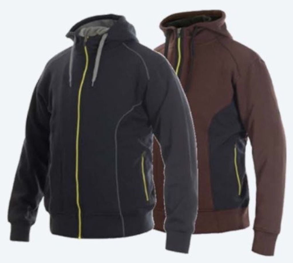 Svart eller brun. Hel dragkedja. Softshell-förstärkningar i sidan. Sidfickor. Material: 55% polyester, 45% bomull. Förstärkningar i 100% polyester
