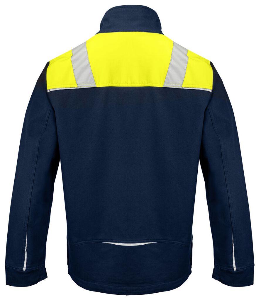 Servicejacka med dragkedja upp i kragen framtill med slå som täcker dragkedjan, även invändig vindslå för att förhindra vinddrag samt hakskydd för att förhindra skav. Fleecefoder i kragen för ökad komfort. Bröstfickor, i den vänstra invändigt fäste för ID-kort. Sidfickor med dragkedja. Rymliga innerfickor, även en invändig telefonficka som försluts med kardborre. Förlängd i rygg. Reglerbara ärmslut med kardborre. Fluorescerande tyg samt reflex över axlarna, även reflexpipings i nederkant baktill samt på fickorna framtill.