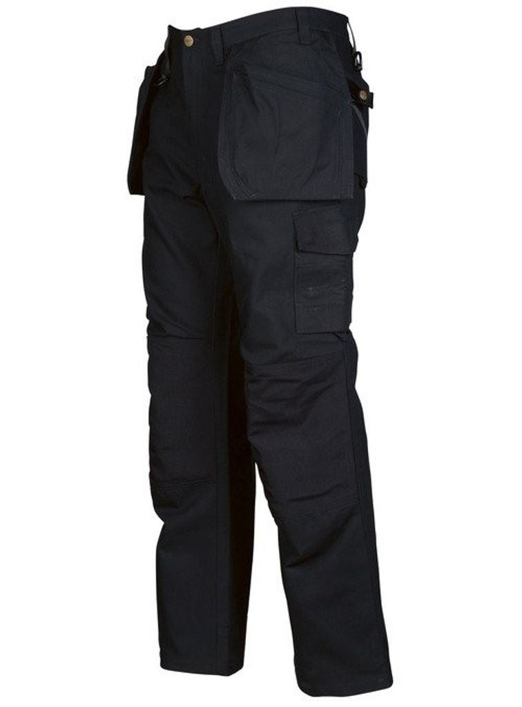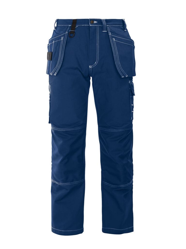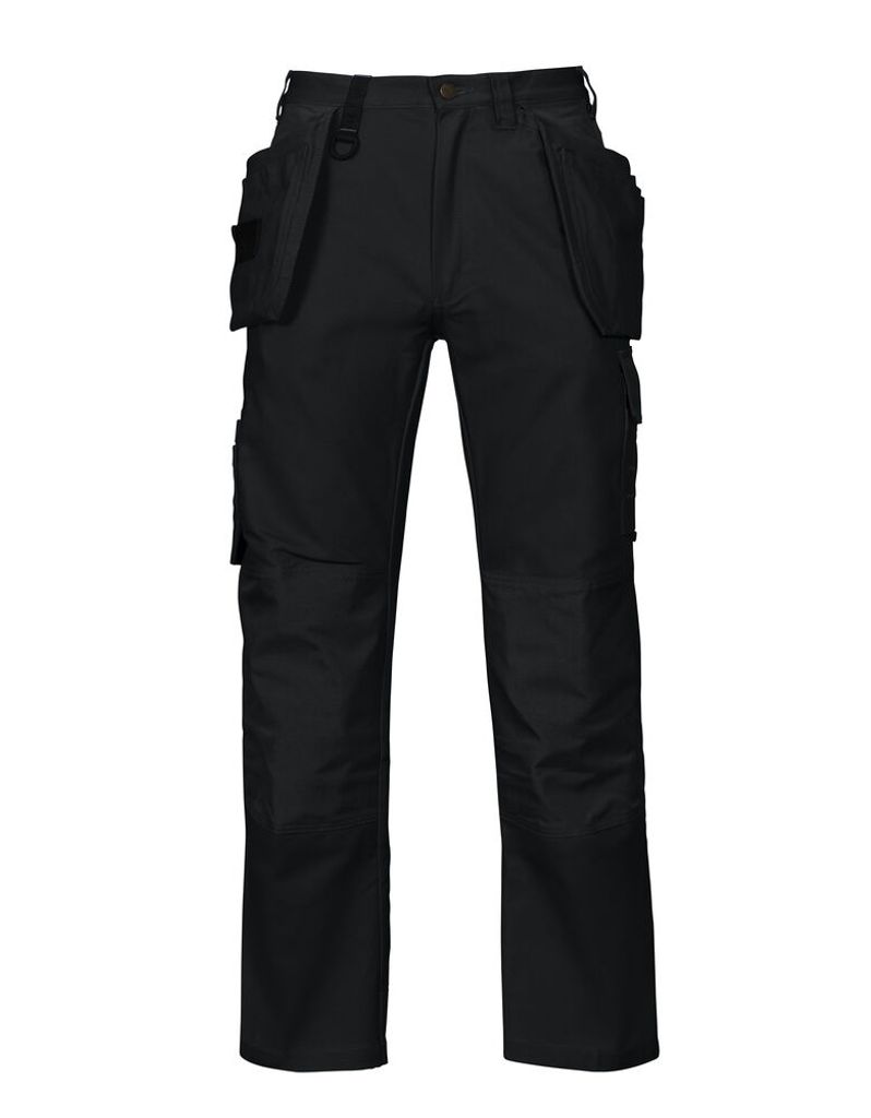 Två hängande spikfickor, som kan stoppas i sidfickorna, en med extra fickor och en med verktygshällor. Spikfickorna är förstärkta med 100 % Cordura®. Benfickor med telefonficka, pennficka och verktygsficka. Två reglerbara hammarhankar. Två D-ringar. Tumstocksficka med verktygsficka och knivknapp. Knäskyddsfickor i Cordura®, öppning inifrån och reglerbar höjd av knäskydden. Förböjda knän. Förstärkt längst ner på baksidan av benen med Cordura®. Bakfickor med övervidd. Bakfickor och benfickor har hällor för Inbags.