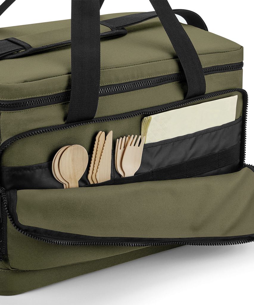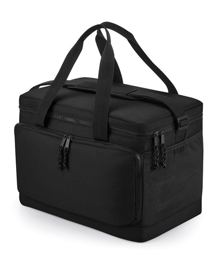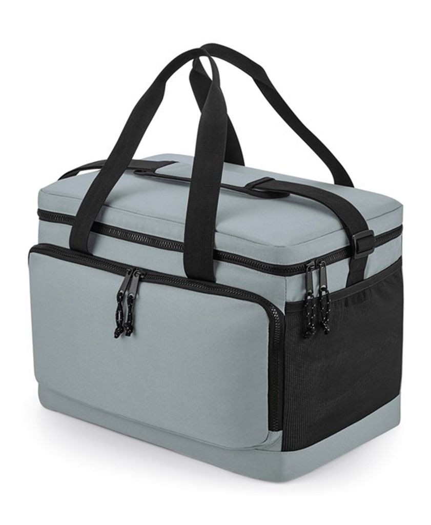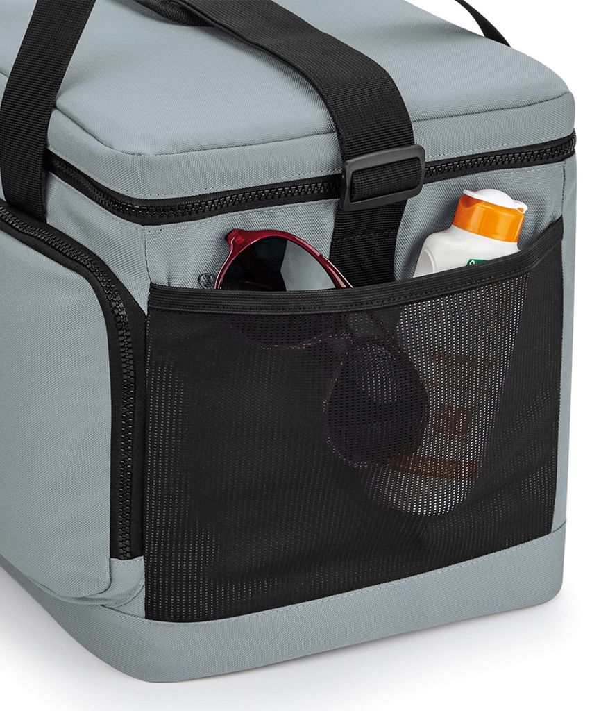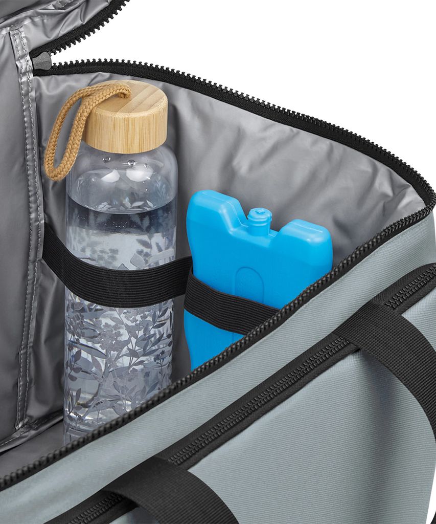 100 % återvunnen 600D polyester. PVC-fri. PEVA-foder – BPA-fritt. Livsmedelssäkert, helt isolerat huvudfack. Huvudfack med dragkedja. Framficka med dragkedja. Sidoficka i stretchig mesh. Avtorkningsbar insida. Hållare för vattenflaskor/isblock. Dubbla bärhandtag. Dragkedja med reflekterande detaljer i snöret. Justerbar axelrem i vävd material.
