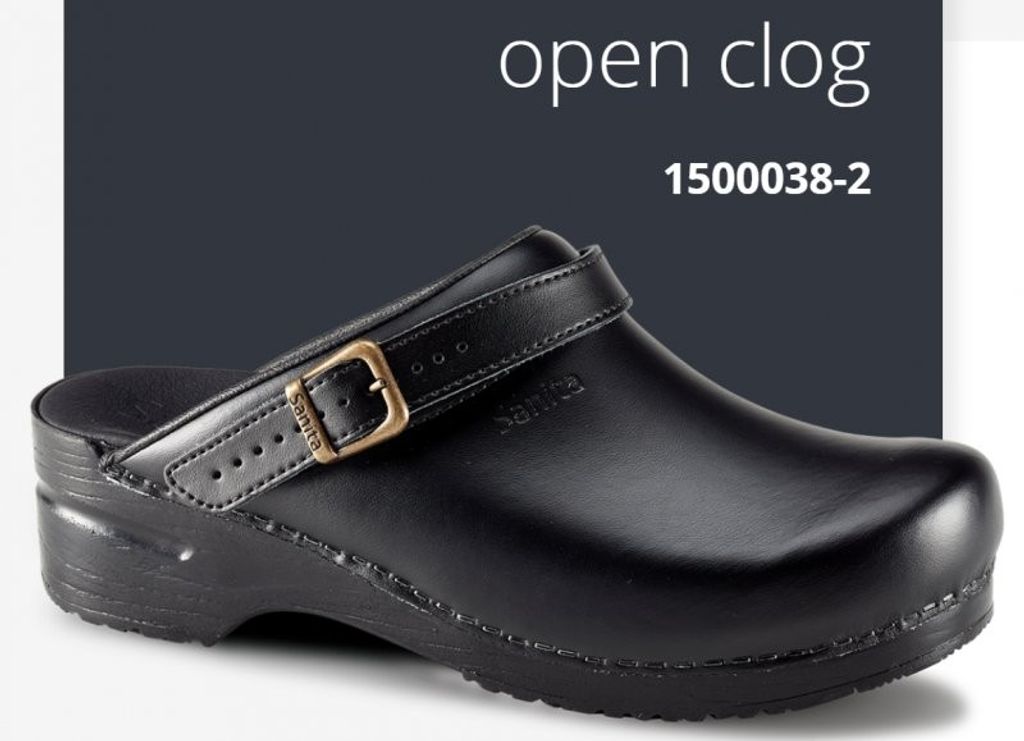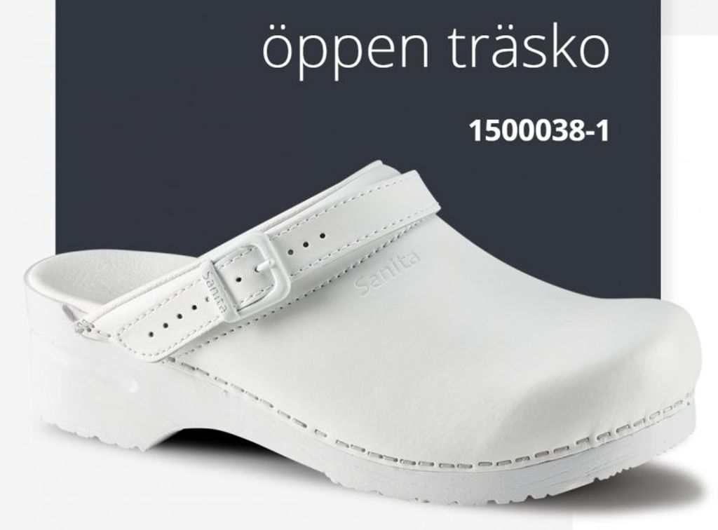 Öppen träsko, med justerbar ryggrem/hälrem, tillverkad av högkvalitativt slitstarkt Permair Protector®-läder. Permair andas och är vattenavvisande. Att använda häftklamrar för att fästa ovandelen på yttersulan är typiskt danskt. Den halksäkra och stötdämpande yttersulan i PU samt den anatomiska fotbädden säkerställer att träskorna är bekväma under hela din arbetsdag.