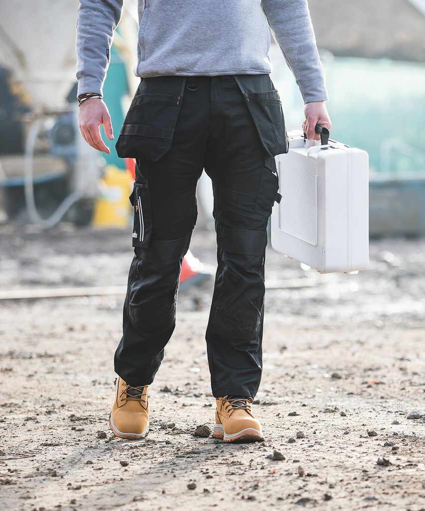 slitstarka förstärkningar vid fåll och fickor. Lättåtkomliga hölsterfickor med verktygshällor för förvaring av verktyg och tillbehör. Cargofickor med dragkedja, tumstocksficka, mobiltelefonficka, hammaröglor och D-ring. Certifierad Sedex.