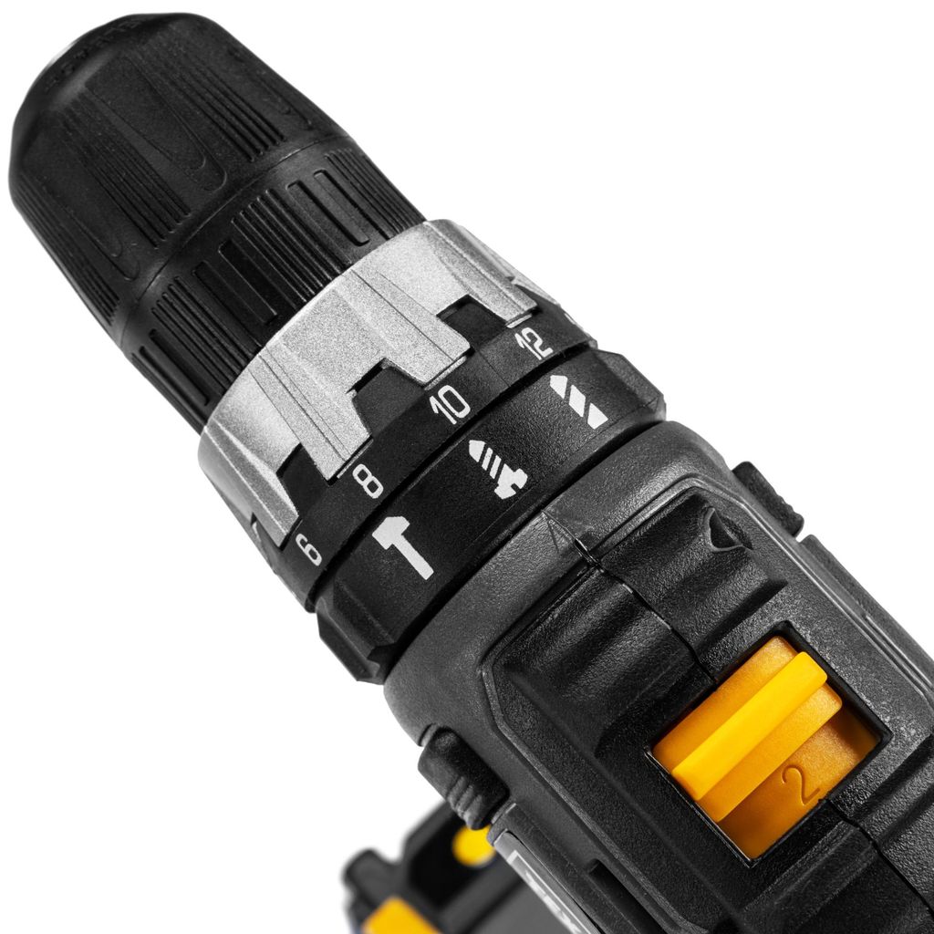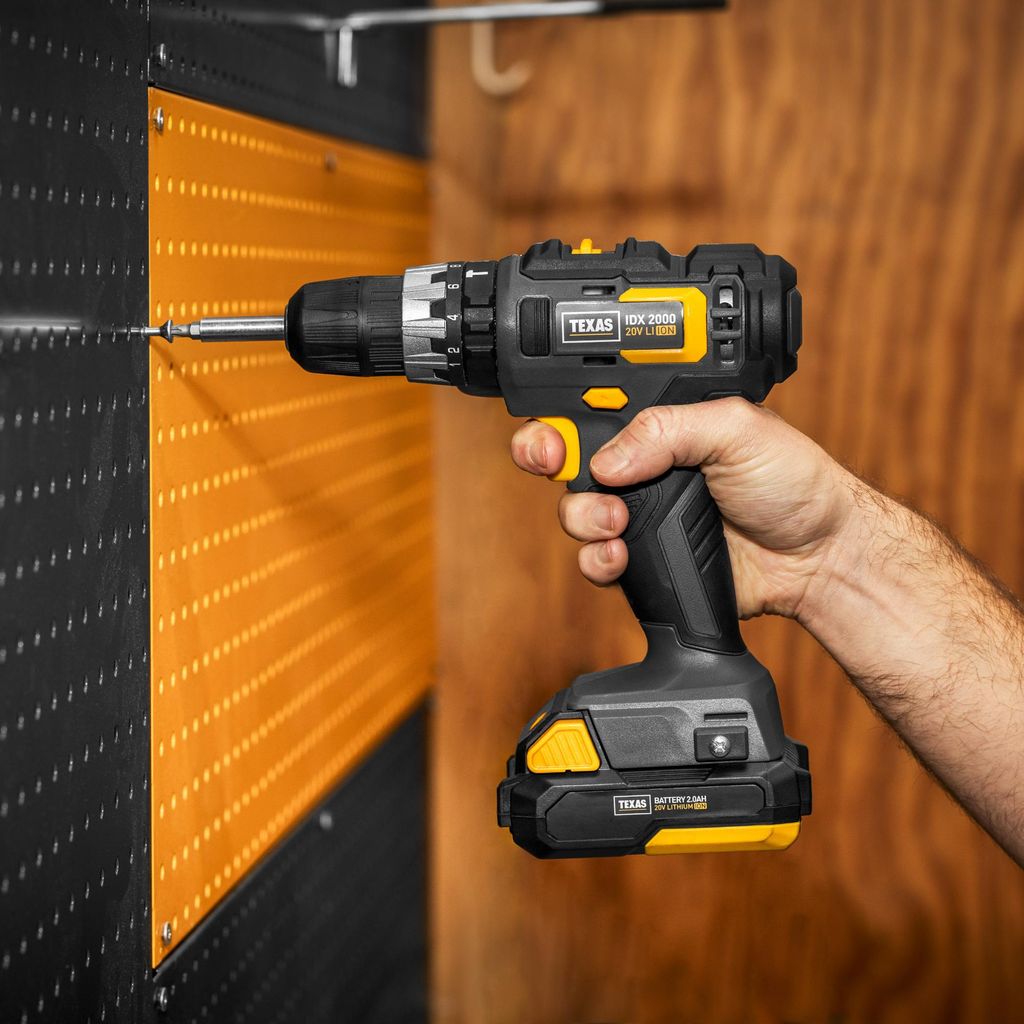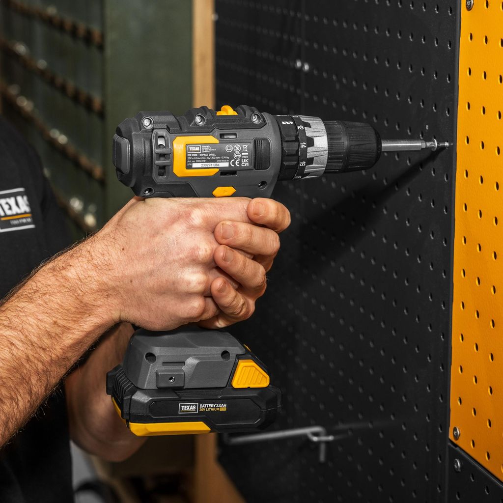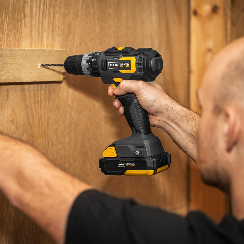 Kompakt sladdlös slagborrmaskin från TEXAS med två växlar som kan utföra tuffa arbeten i trä, murverk och metall, samtidigt som den förblir bekväm att arbeta med.