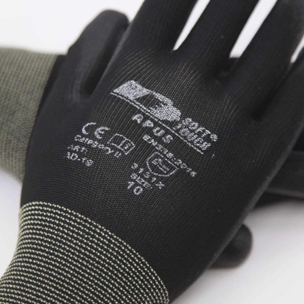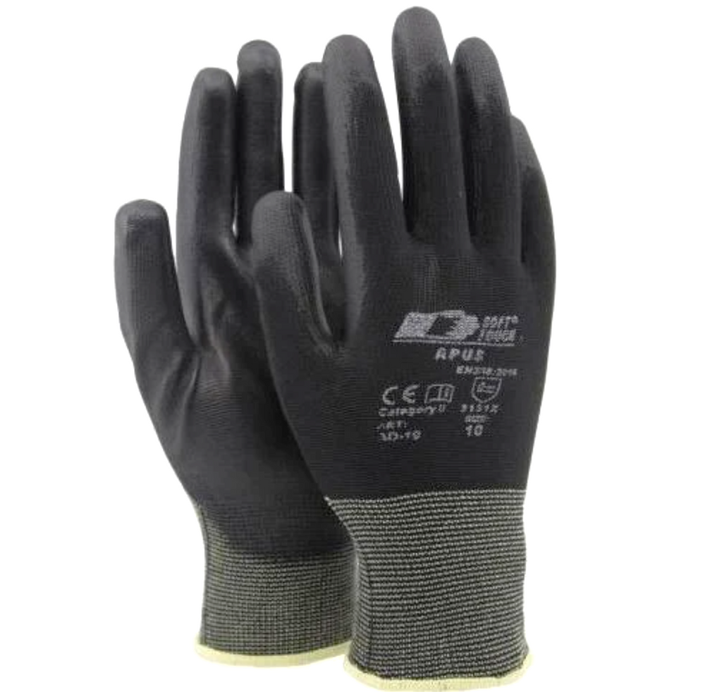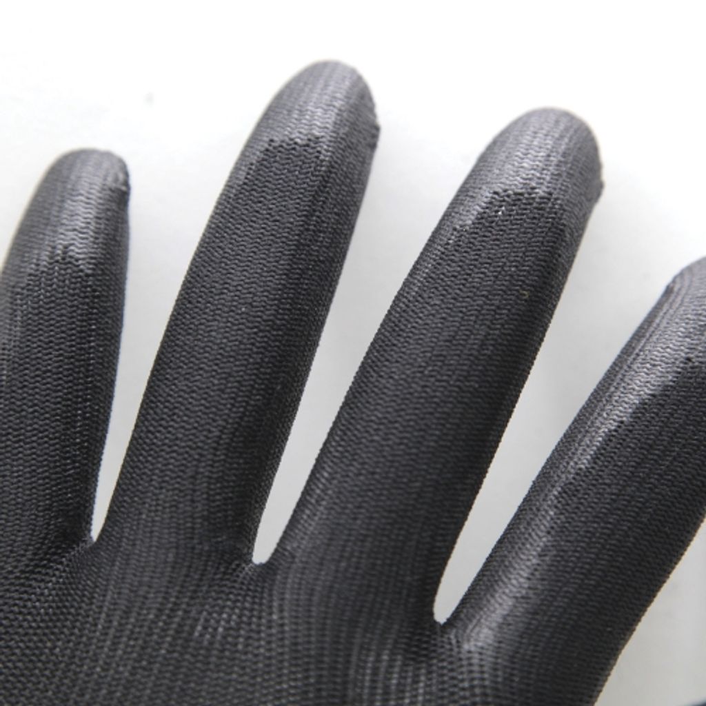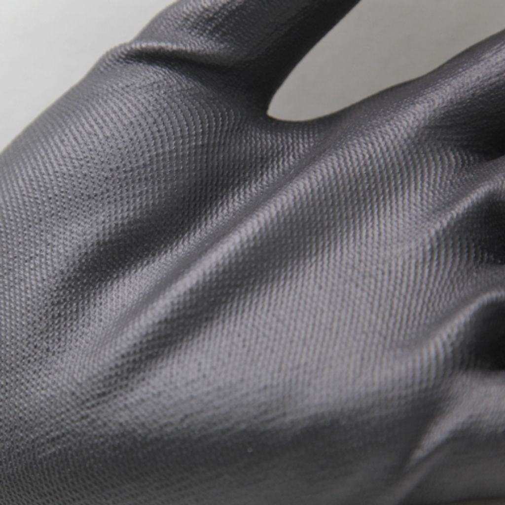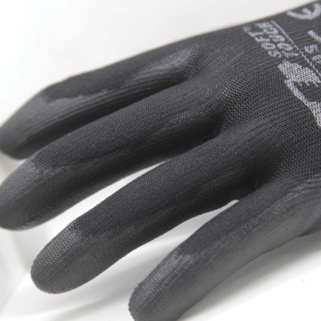Sömlös stickad svart nylonhandske med svart PU-beläggning i innerhand och på fingertoppar. Genom sin konstruktion bekväm och anpassad efter handens form. Materialet ger användaren ett extremt bra grepp. Handsken är tvättbar vilket ger extra ekonomi. Handsken lämpar sig särskilt väl vid montering, packning med särskilt höga krav på bra grepp och högprecision. Slitstark och bra grepp.