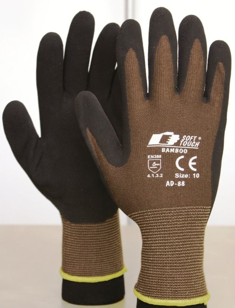 Stickad handske i bambufiber, doppad i 100% naturlatex i innerhand och över fingertopparna. Materialen är 100% ekologiskt nedbrytbart vilket gör handsken till ett miljövänligt val. Inga kemikalietillsatser har använts under tillverkningsprocessen, vilket gör att handsken inte orsakar någon hudirritation. Bambufiber har unika egenskaper som mjukhet, slitstyrka, god andningsförmåga, naturligt antibakteriell och tvättbarhet. Bambutextilen är mycket elastiskt och latexdoppningen har en lätt ruggad yta vilket gör handsken extremt smidig och greppsäker.