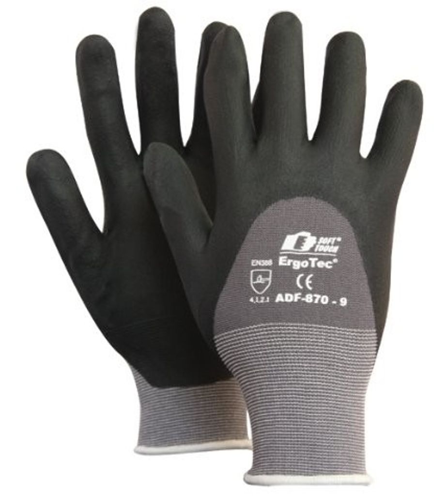 Soft Touch ErgoTec Plus ADF-870Sömlös stickad handske i nylon/lycra som är halvdoppad i en PU- och nitrilblandning i innerhanden, över fingrar och upp över knogarna för ökat skydd. Handsken ger mycket bra grepp och kan med fördel användas för alla typer av precisionsarbeten. Handsken är silikonfri, fri från lösningsmedel och lämnar inga fingeravtryck. Handsken klarar displayer och mobiltelefon utan att man behöver ta av handske. Storlekar: 7-11