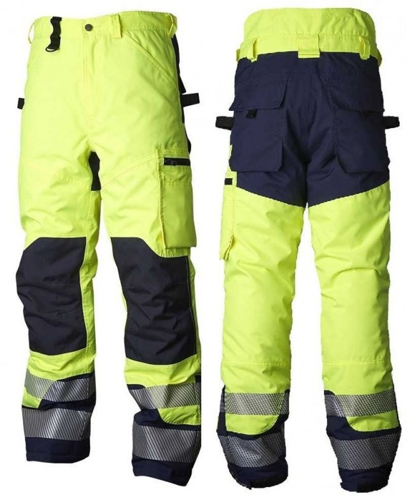 Midjebyxa/transportbyxa klass 1. Benfickor m dold dragkedja. &5% polyester, 35% bomull. Storlek: C46-C62, C146-C156, D96-D120. Marin/Gul