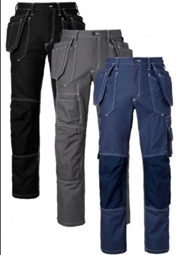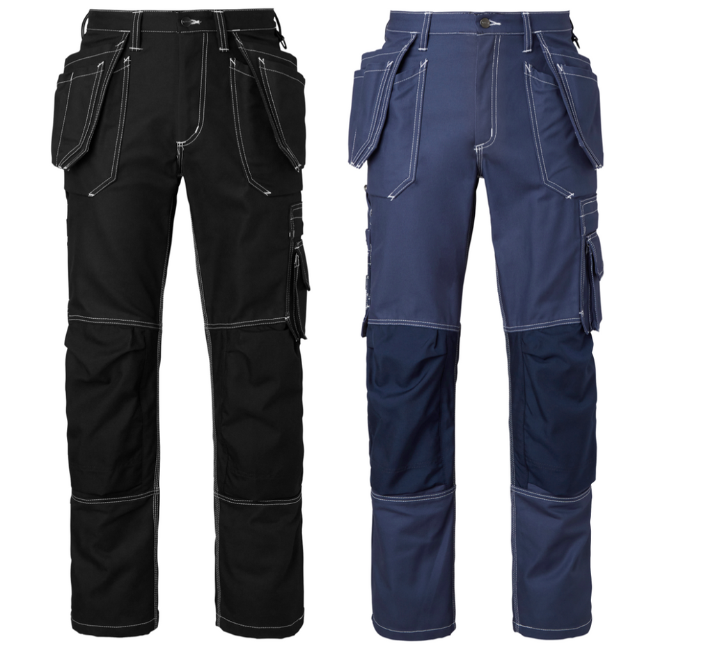 Hantverksbyxa med förböjda ben och knäfickor av CORDURA. Knäskydden kan placeras i två nivåer. Två framfickor och två bakfickor med bälg förstärkta med CORDURA. Löst hängande spikfickor förstärkta med CORDURA. Vänster hängficka med extra ficka. Höger hängficka med tre mindre extrafickor och dold id-korts ficka som går att fälla ner. Reglerbar hammarhank. Framflyttad tumstocksficka som är släppt nertill för bättre komfort.Tumstocksfickan är utrustad två knivhållare, hälla och pennfack. Benficka med dold dragkedja. pennfack och telefonficka. D-ring.