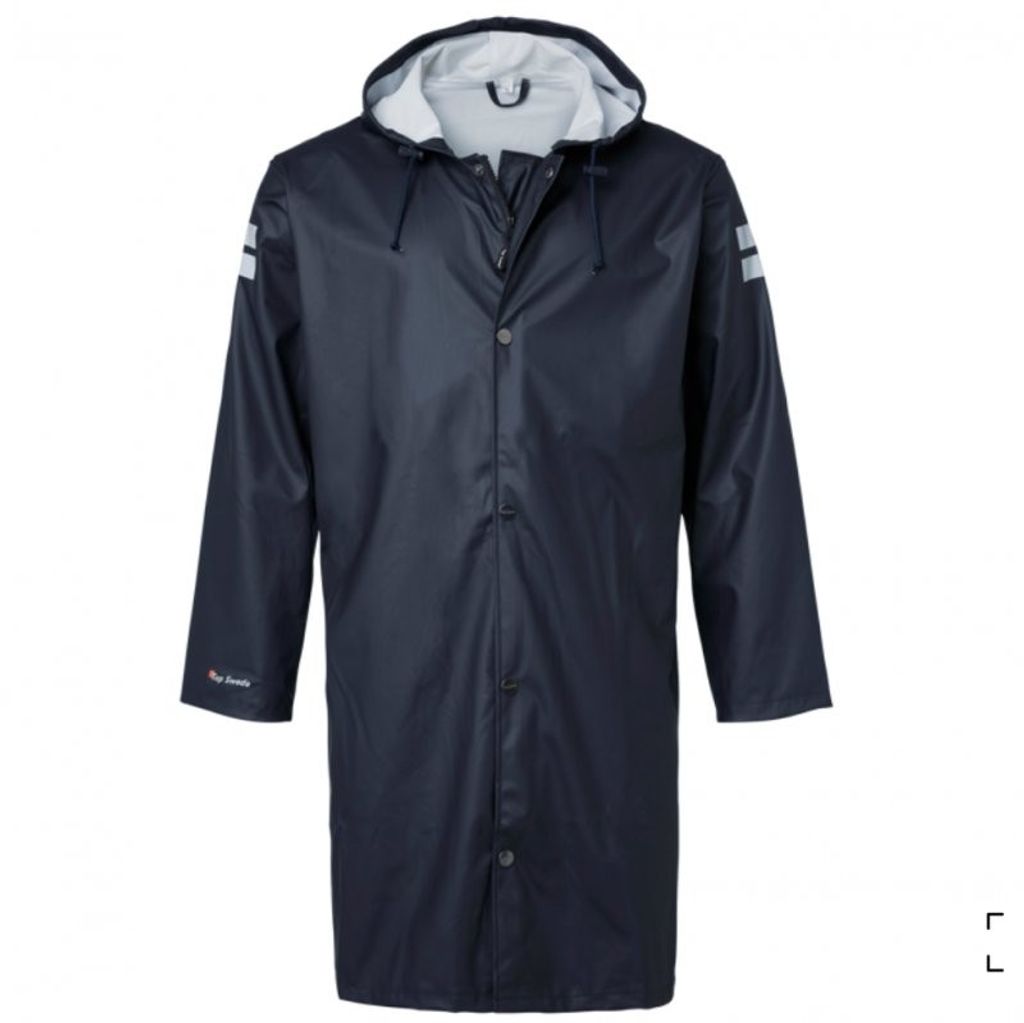 Vindslå och tryckknappar. Svetsade sömmar. Reglerbara resår. Polyester/PU. Marinblå. Storlek XS-3XL.