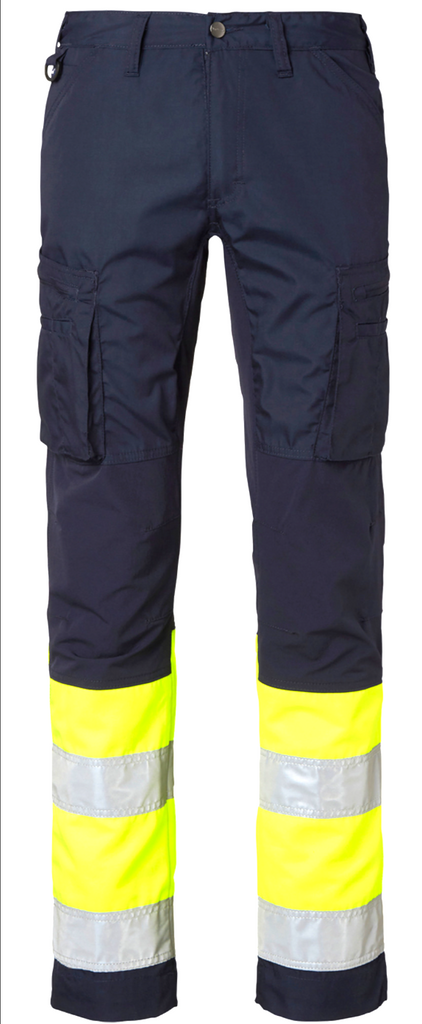 Midjebyxa/transportbyxa klass 1. Benfickor m dold dragkedja. &5% polyester, 35% bomull. Storlek: C46-C62, C146-C156, D96-D120. Marin/Gul