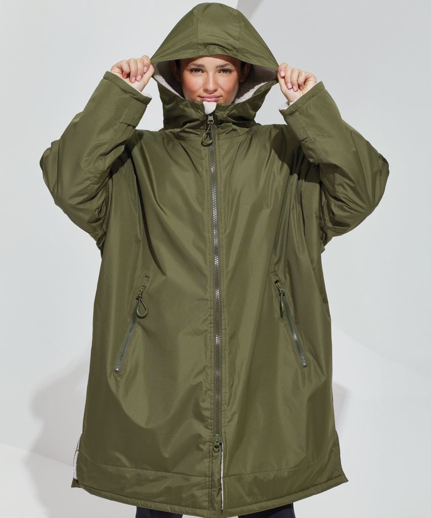Unisex praktisisk omklädningsrock före eller efter aktivitet. Sherpafleece foder. Storlekar: S/M och L/XL.