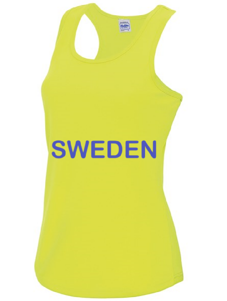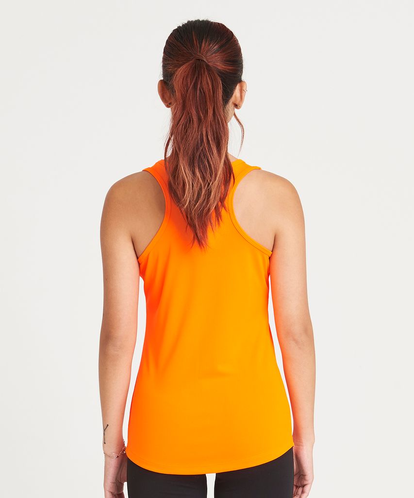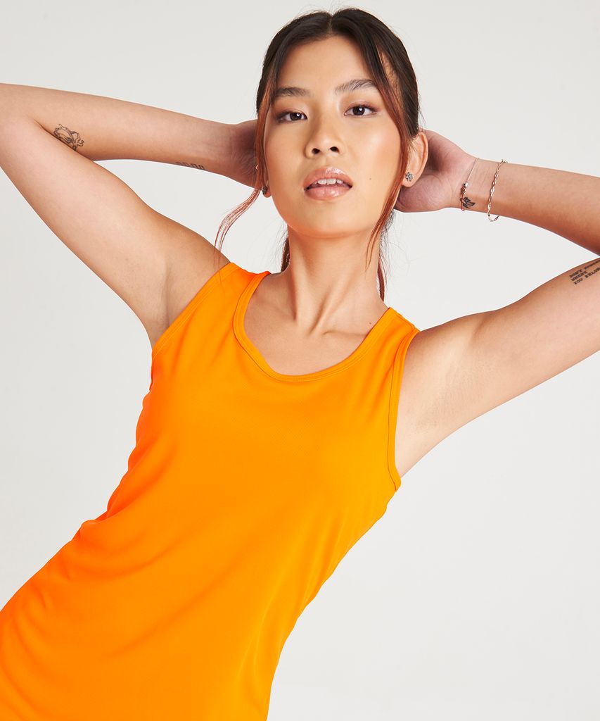Kvinnlig passform. Racerback stil. Böjd bakkant för extra komfort. AWDis eget Neoteric™ texturtyg som transporterar bort fukt och snabbtorkande egenskaper. Självtygsbindning runt halsringning och ärmhål.